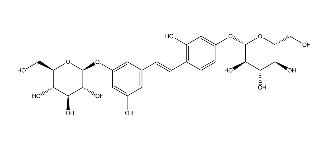 【英文別稱】 (2S,3R,4S,5S,6R)-2-[3-hydroxy-4-[(E)-2-[3-hydroxy-5-[(2S,3R,4S,5S,6R)-3,4,5-trihydroxy-6-(hydroxymethyl)oxan-2-yl]oxyphenyl]ethenyl]phenoxy]-6-(hydroxymethyl)oxane-3,4,5-triol