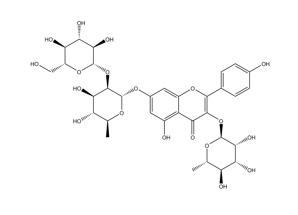 【英文別稱】 7-[(6-Deoxy-2-O-β-D-glucopyranosyl-α-L-mannopyranosyl)oxy]-3-[(6-deoxy-α-L-mannopyranosyl)oxy]-5-hydroxy-2-(4- hydroxyphenyl)-4H-1-benzopyran-4-one